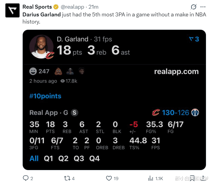 骑士记者:加兰合同五年1.97亿,但他上半场三分球10中0,全场三分11中0。