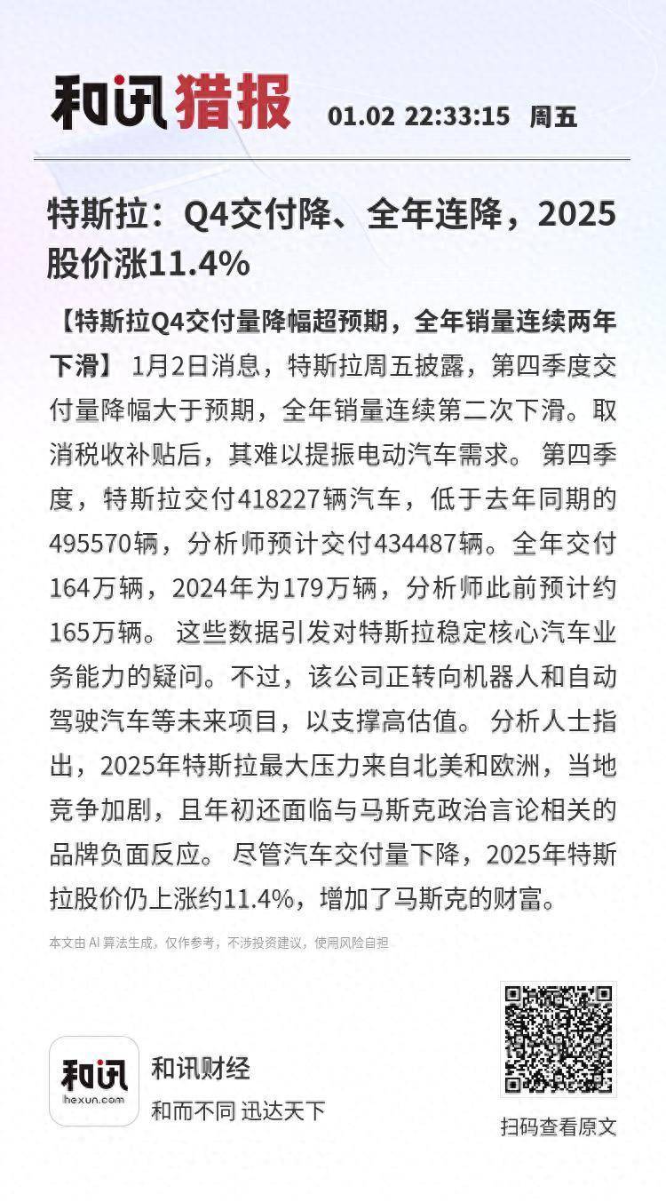 【特斯拉Q4交付量降幅超预期,全年销量连续两年下滑】1月2日消息,特斯拉周五披露,第四季度交付量降幅大于预期,全年销量连续第二次下滑。取消税收补贴后,其难以提振电动汽车需求。 第四季度,特斯拉交付418227辆汽车,低于去年同期的495570辆,分析师预计交付434487辆。全年交付164万辆,2024年为179万辆,分析师此前预计约165万辆。 这些数据引发对特斯拉稳定核心汽车业务能力的疑问。不过,该公司正转向机器人和自动驾驶汽车等未来项目,以支撑高估值。 分析人士指出,2025年特斯拉最大压力来自北美和欧洲,当地竞争加剧,且年初还面临与马斯克政治言论相关的品牌负面反应。 尽管汽车交付量下降,2025年特斯拉股价仍上涨约11.4%,增加了马斯克的财富。