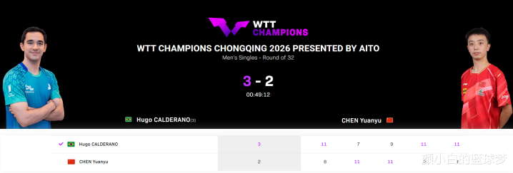 WTT重庆冠军赛男单1/16决赛,陈垣宇2-3惜败雨果-卡尔德拉诺,五局比分:8-11、11-7、11-9、8-11、6-11。换言之陈垣宇在大比分2-1领先的情况下被雨果逆转了,国乒这位20岁的小将就这样被雨果复仇了。
